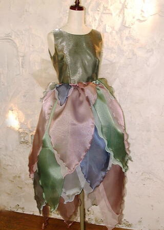 フクレ生地のブラウン色に、下にピンク色を持ってきて微妙なパープル色に変化した、綺麗系およばれドレス。ネックレス等を引き立てるために、大きく開けたU字の衿、袖にはちょうちん形にして、そこにスリットを入れて可愛く。ウエスト位 ...