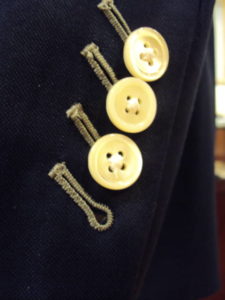 肩から第一ボタン位置も体形で補正算出している!ボタンは特注貝、裏地はユーロデザインのキュプラ水色ペイズリーと満載感のスーツ!