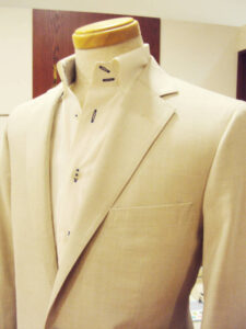 イタリアの一流ブランド生地「カノニコ」の超イケてるベージュ系スーツ!リネンの涼しさとウールの耐シワ性、それにシルクを入れてウール・シルク・リネンの3種混紡!なのでドレッシー&ゴージャスな雰囲気に仕上がるわけ!シルエは毛芯共に薄くパット無し、襟もとVゾーンチョイ深めのシェイプ位置低めにイタリアンテイスト意識!ありがちピチピチスーツでは上品さも出ない。