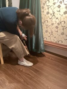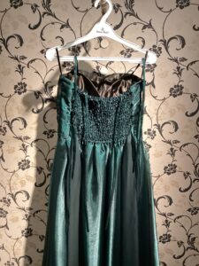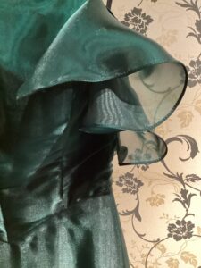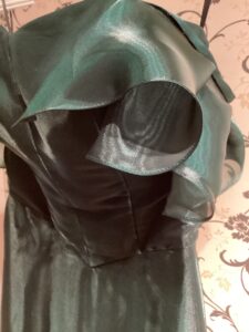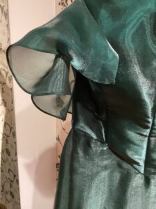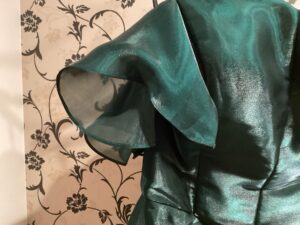 元々袖無しノースリーブのドレスに、新たに袖を作ることに!袖作成の生地はすそから計算して10数センチだけ丈カットして使用!!シンプルなのに華やかさもアクセントで演出出来るよう!さらに二の腕もカバー出来るわけ!