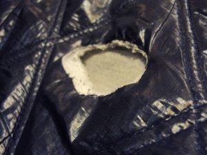中綿のジャンパー。後ろ背中部分に開いた破れ。さすがにこの大きいダメージは珍しい。ナイロン表皮ももちろん中綿も無くなっている