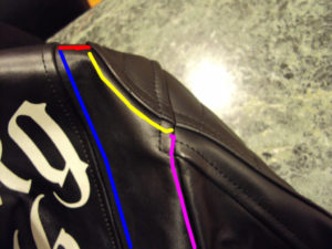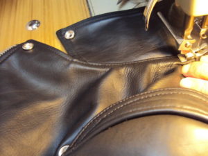 背中左右のパネルを外してパネルの外側レザーをカットして身幅つめ。上部肩周辺も外したことが見て取れる。肩には大型パットが覆い被さっていたが隙間数センチをギリギリサイズダウンし接合。